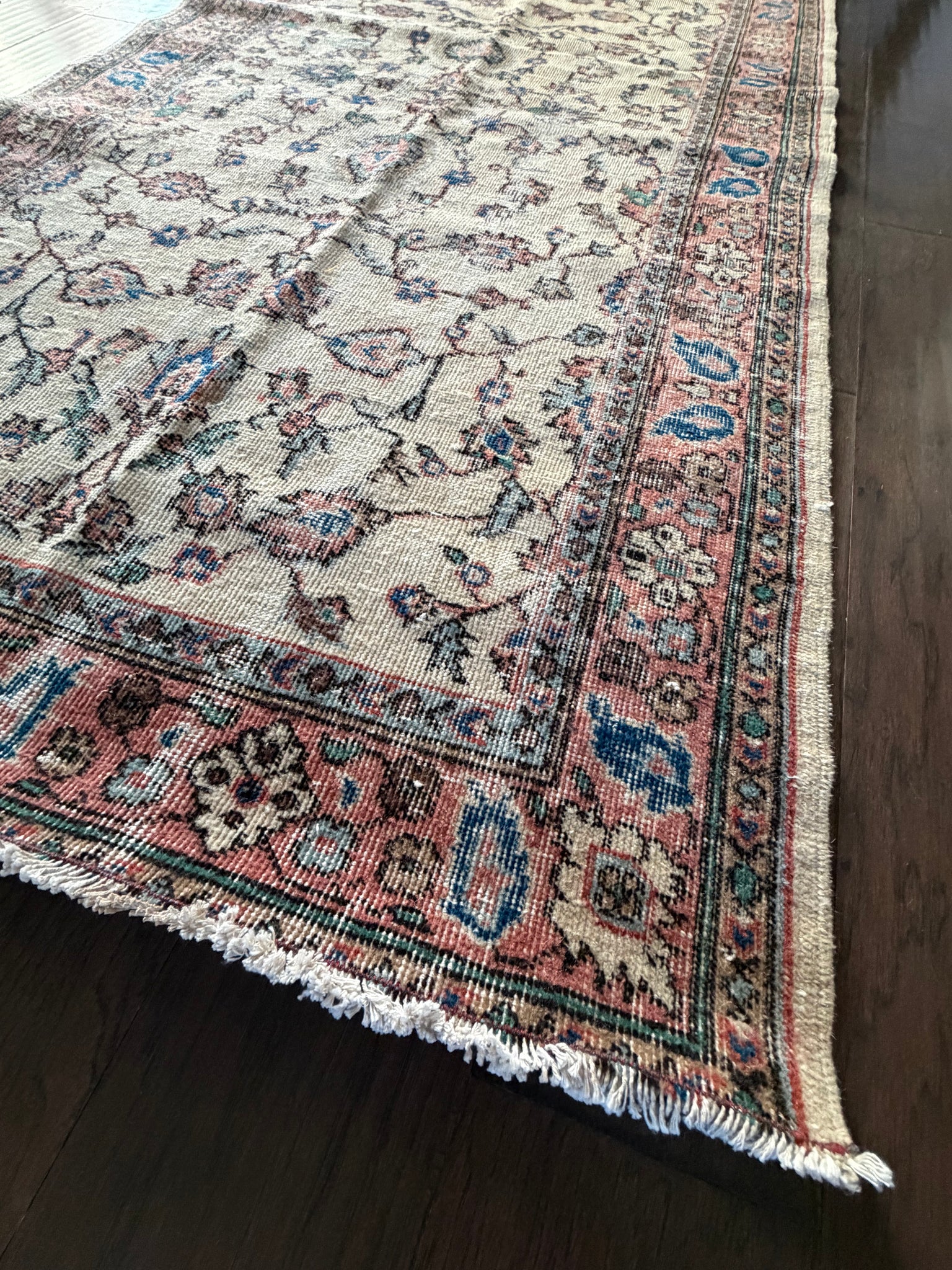Warm peachy pink border with an ecru center and blue, green and tan accents.