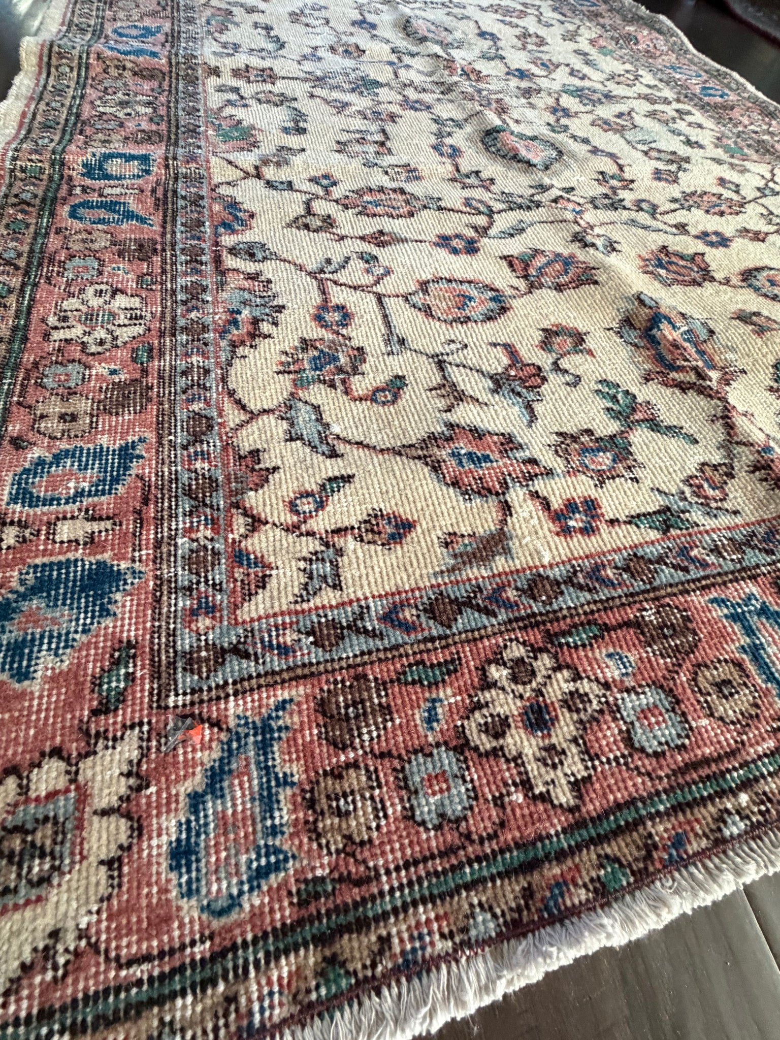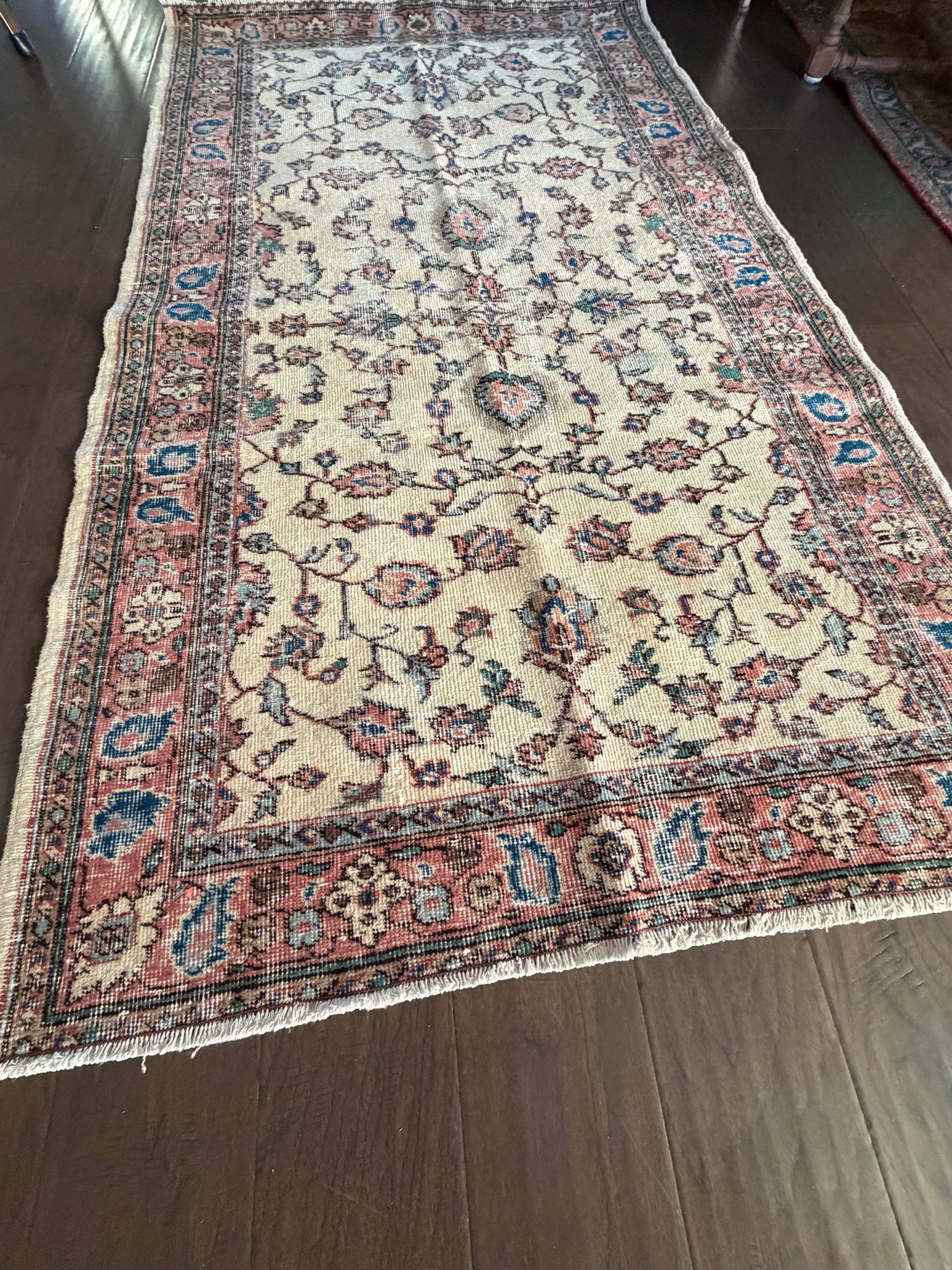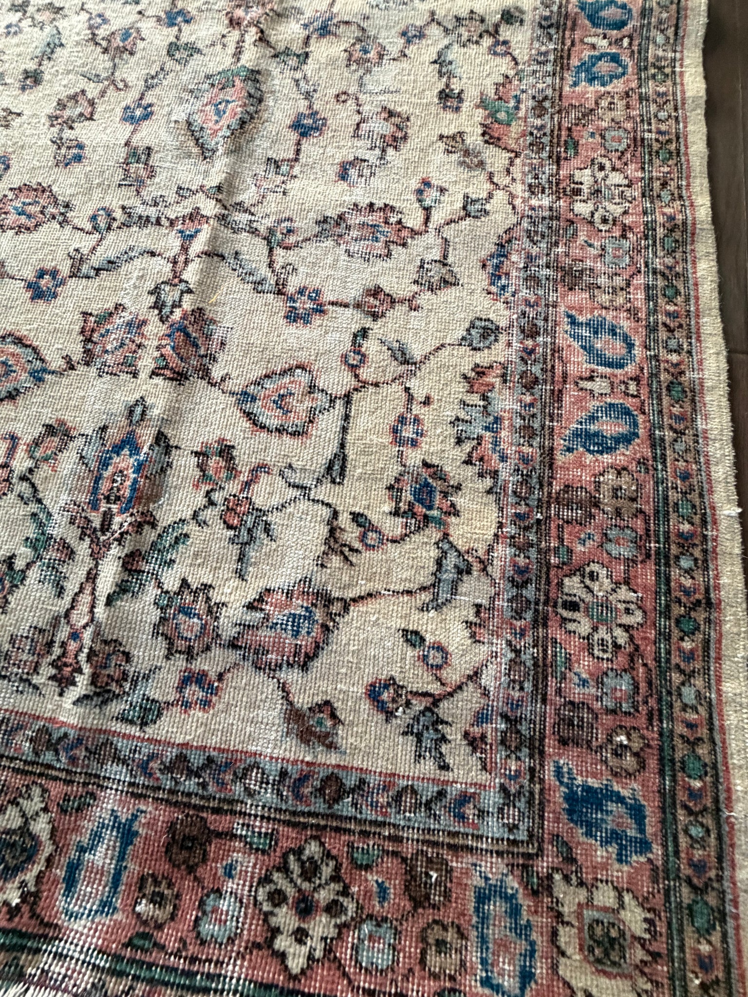 100% wool, vegetable dyed. This is a vintage item that may have some stains, wear, worn spots, repairs, holes, fading or other naturally occurring damage. We only offer items we would be happy to have in our own homes but want you to be aware that you are not purchasing brand new condition items!