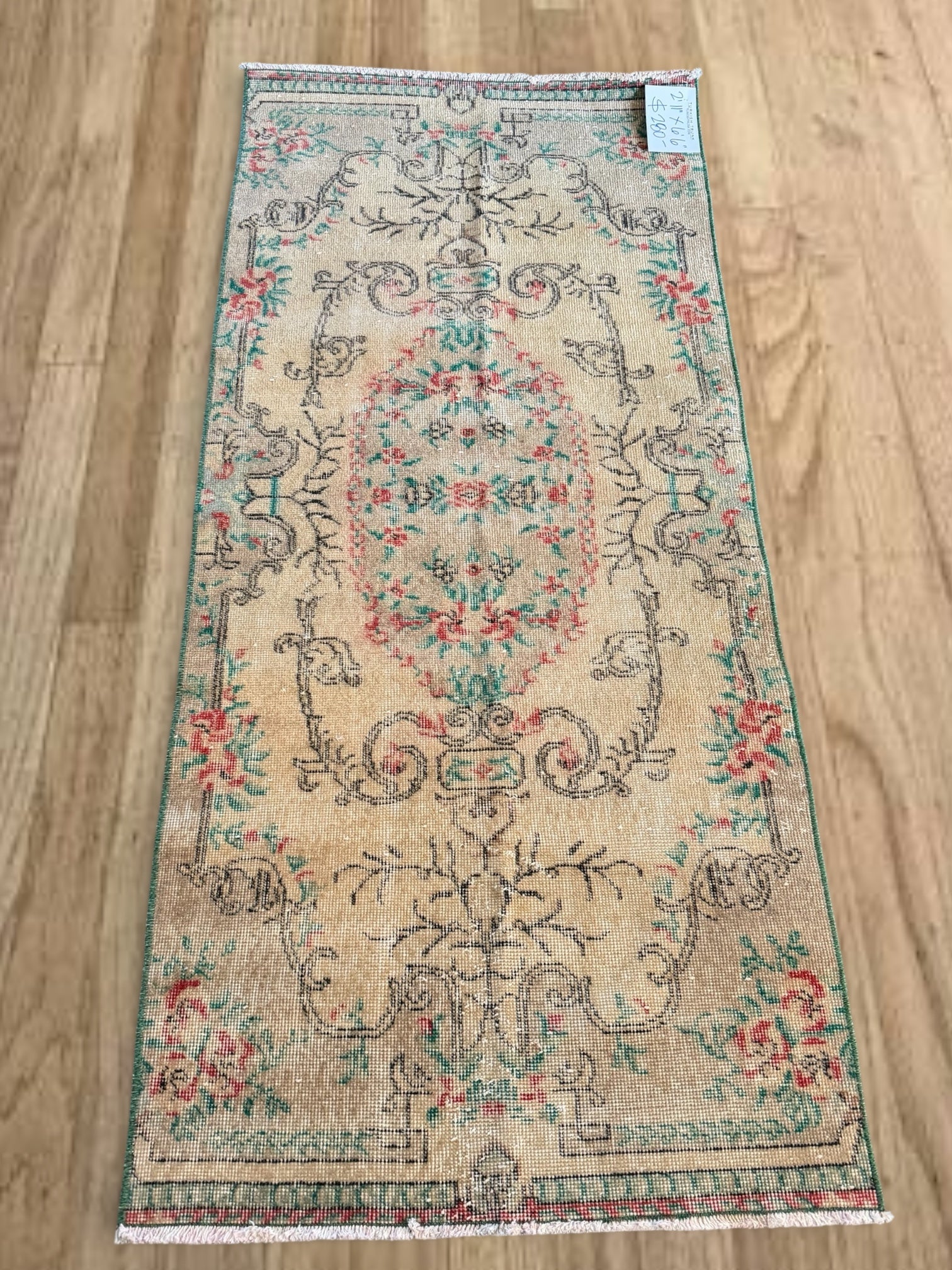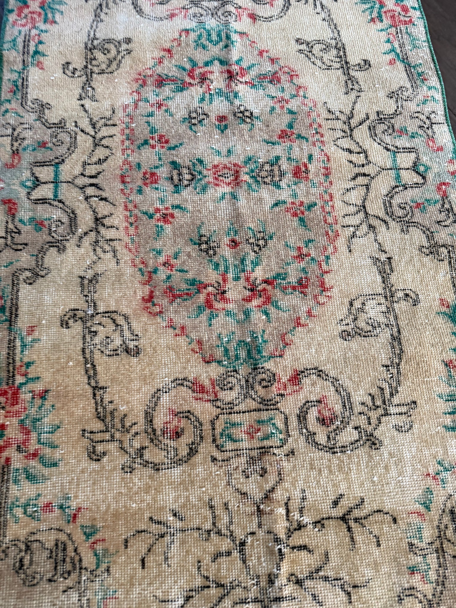 100% wool, vegetable dyed. This is a vintage item that may have some stains, wear, worn spots, repairs, holes, fading or other naturally occurring damage. We only offer items we would be happy to have in our own homes but want you to be aware that you are not purchasing brand new condition items!