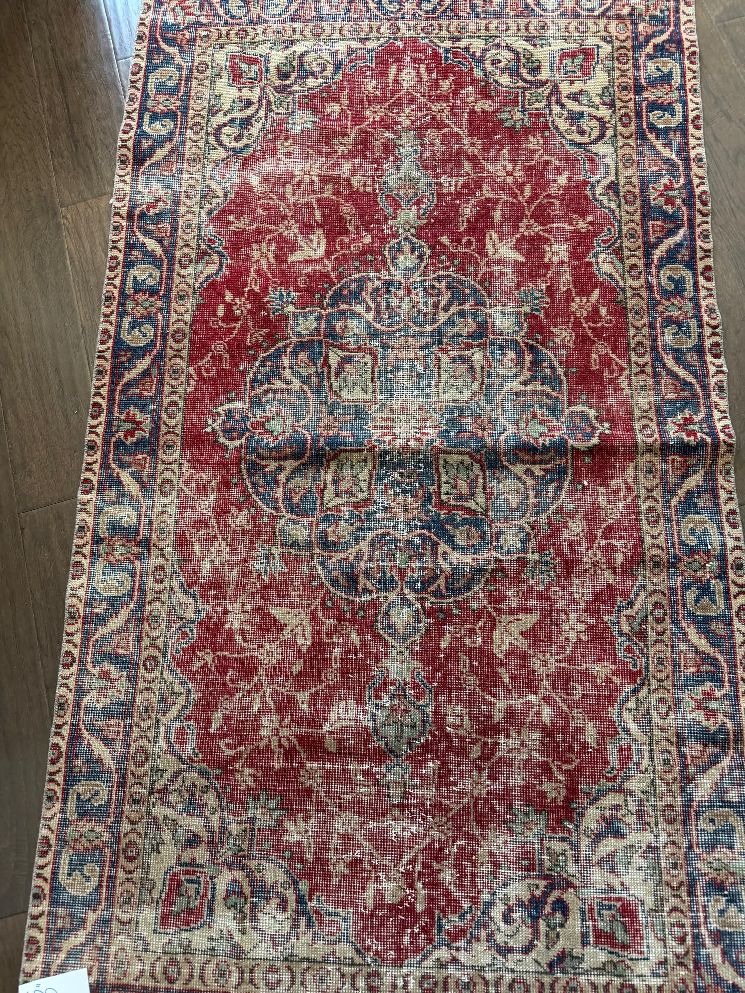 100% wool, vegetable dyed. This is a vintage item that may have some stains, wear, worn spots, repairs, holes, fading or other naturally occurring damage. We only offer items we would be happy to have in our own homes but want you to be aware that you are not purchasing brand new condition items!