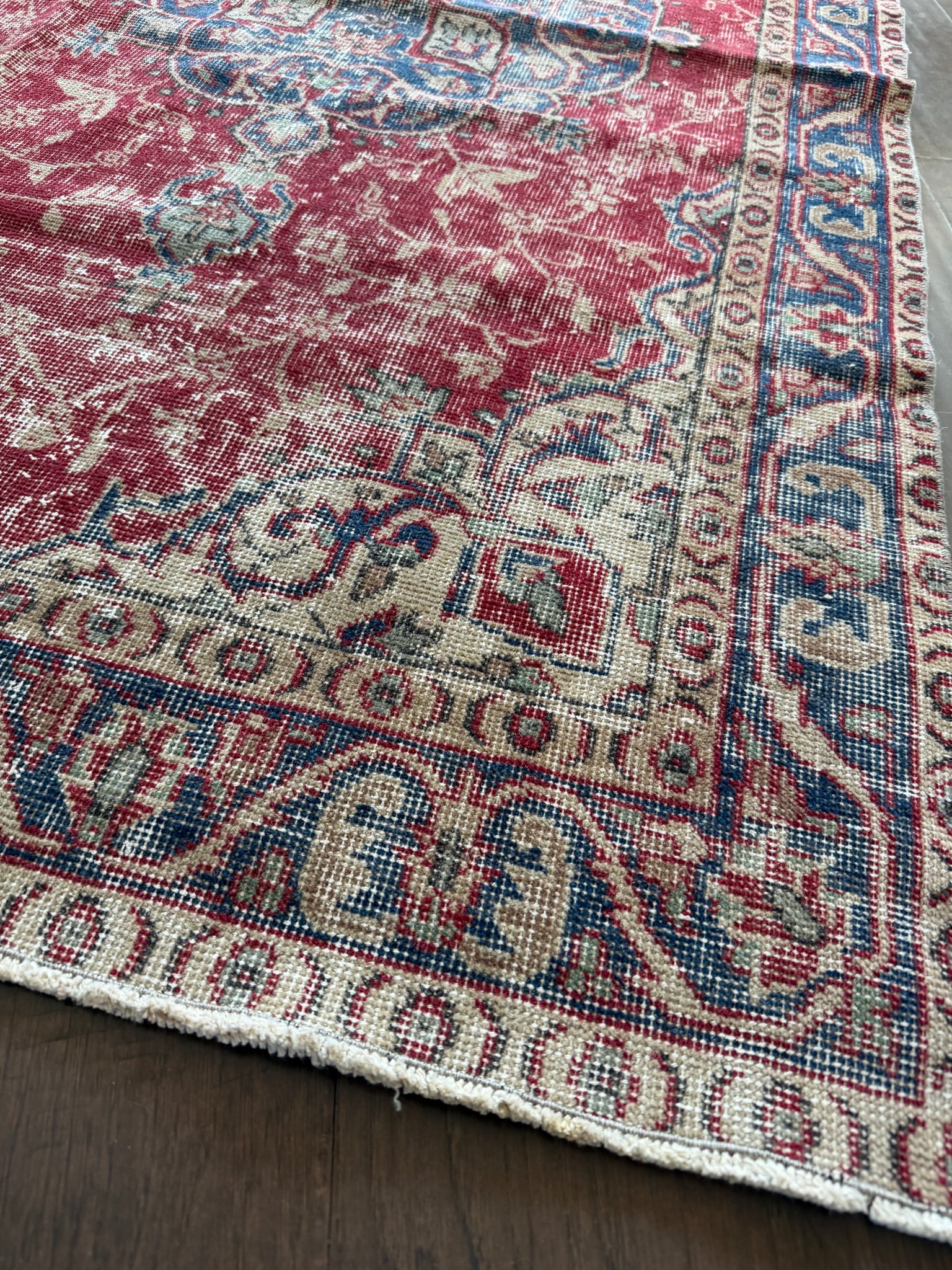 Crimson rug with Navy border with tan, sage and ecru accents.