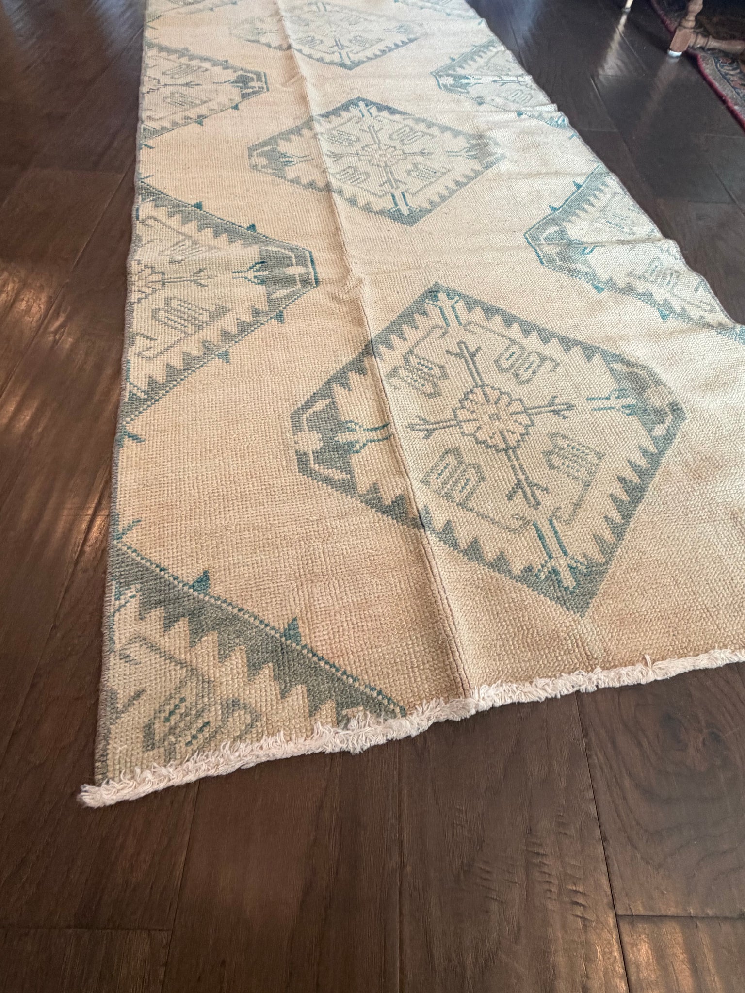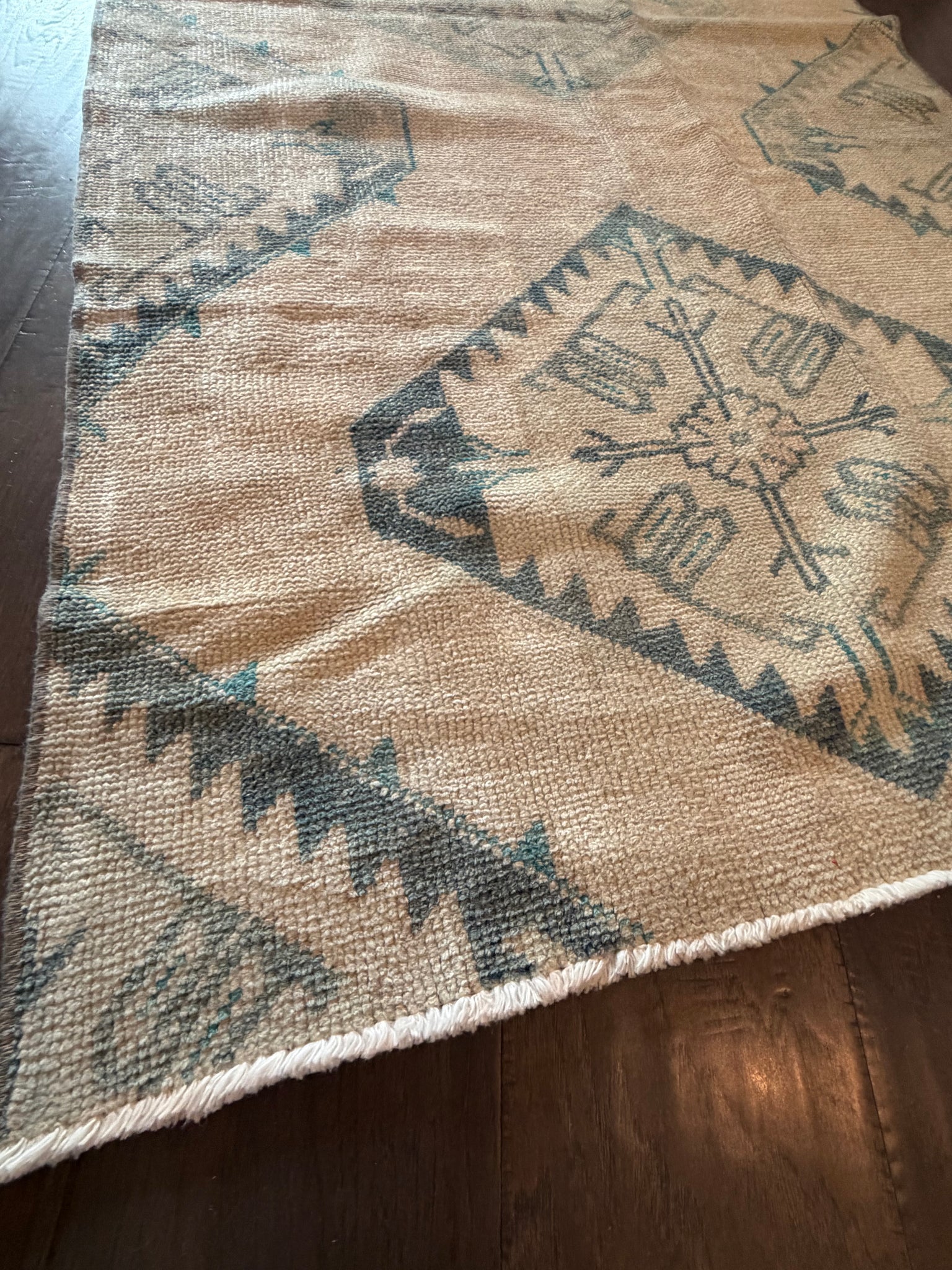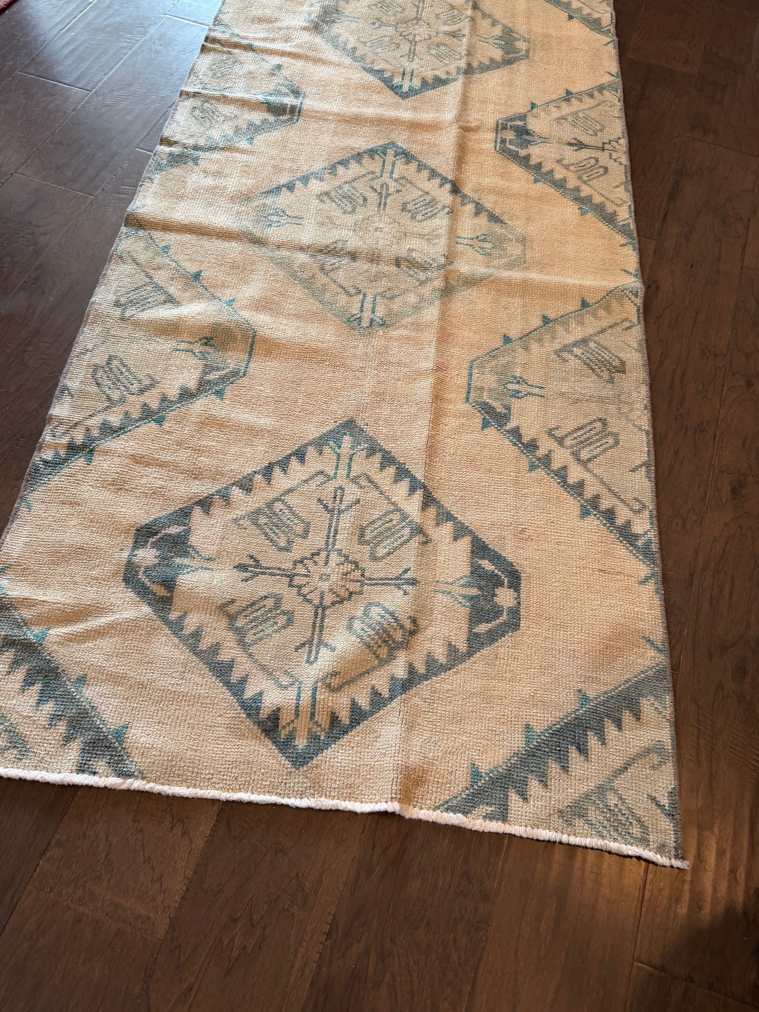 100% wool, vegetable dyed. This is a vintage item that may have some stains, wear, worn spots, repairs, holes, fading or other naturally occurring damage. We only offer items we would be happy to have in our own homes but want you to be aware that you are not purchasing brand new condition items!