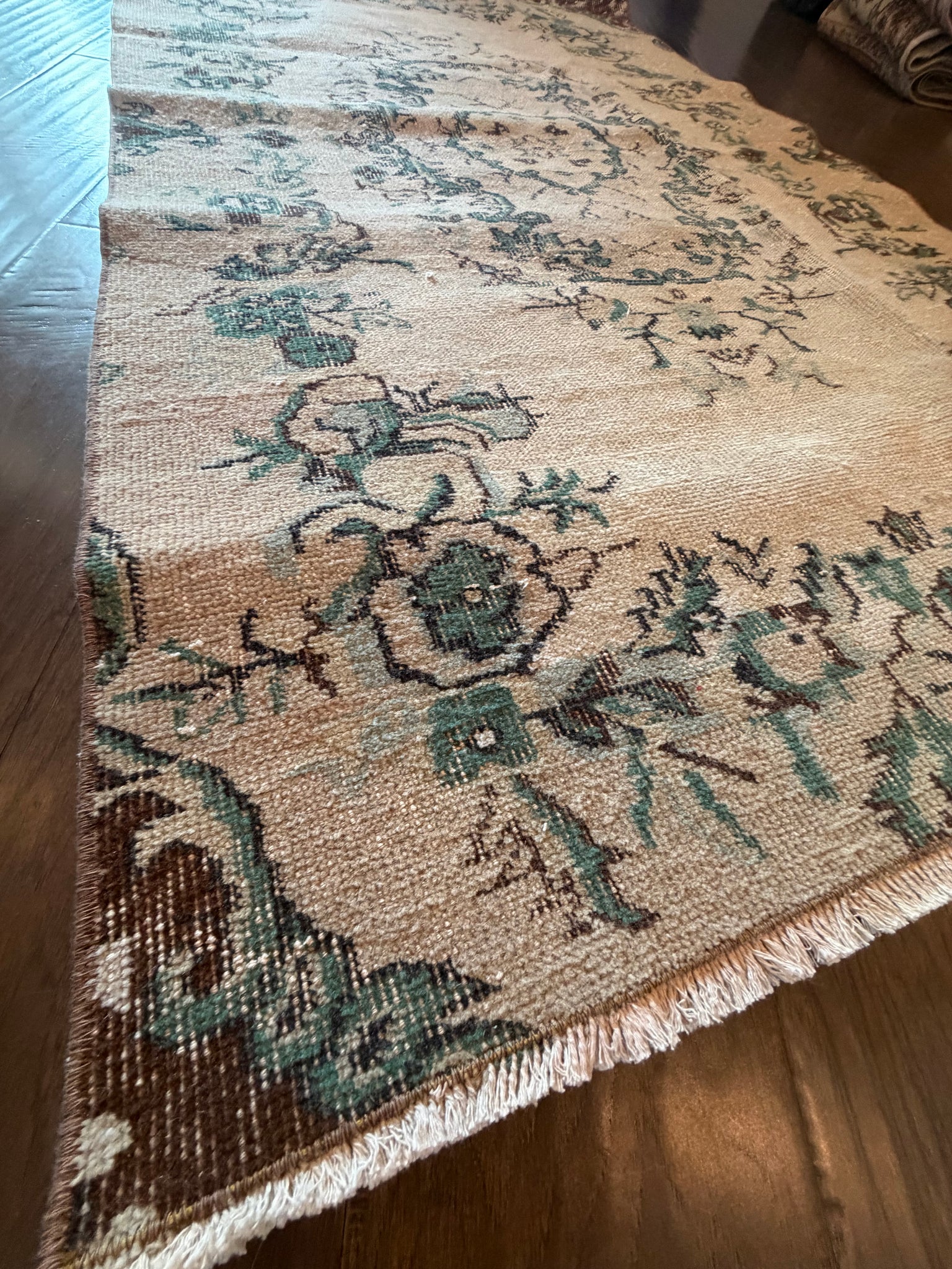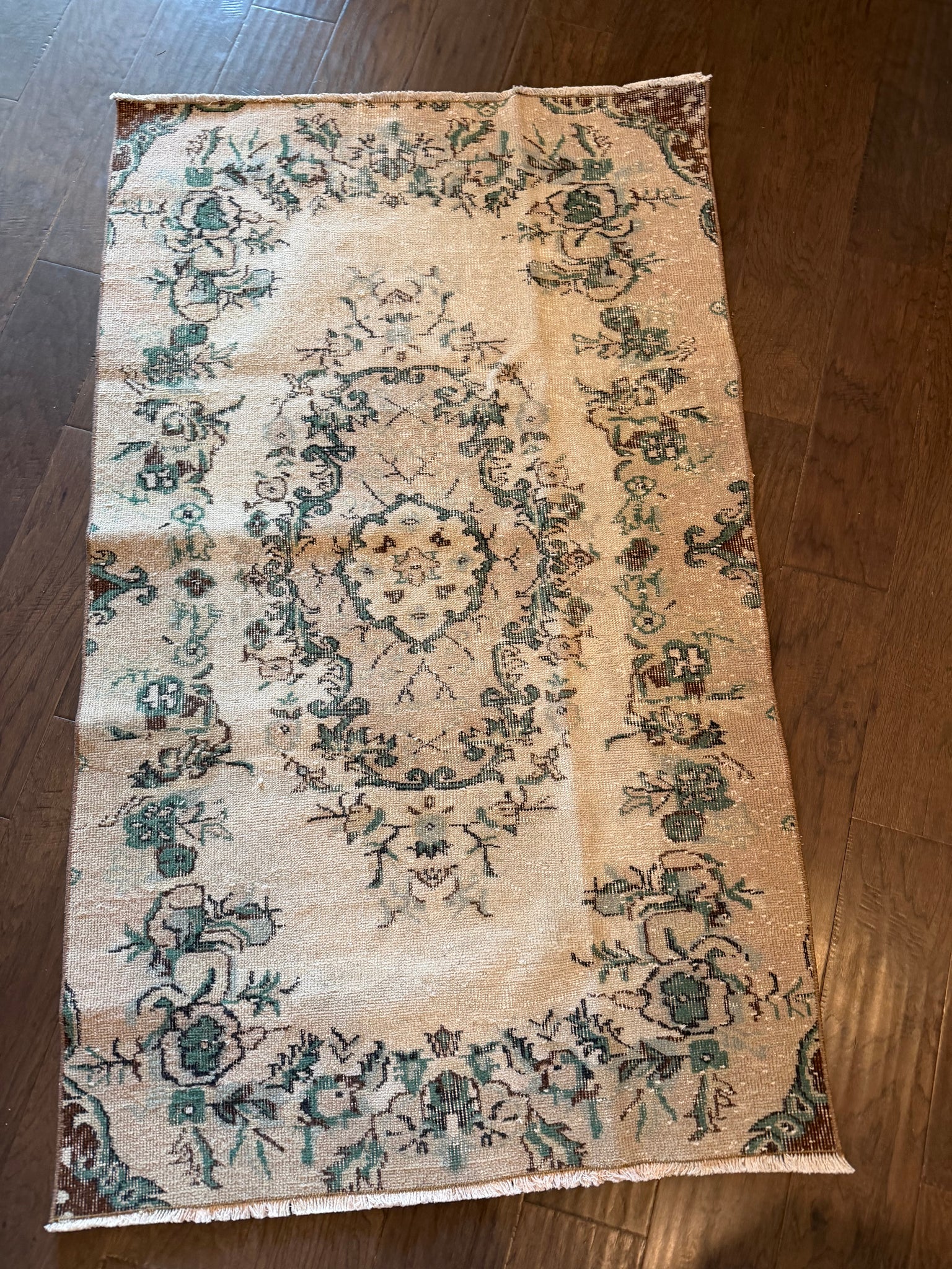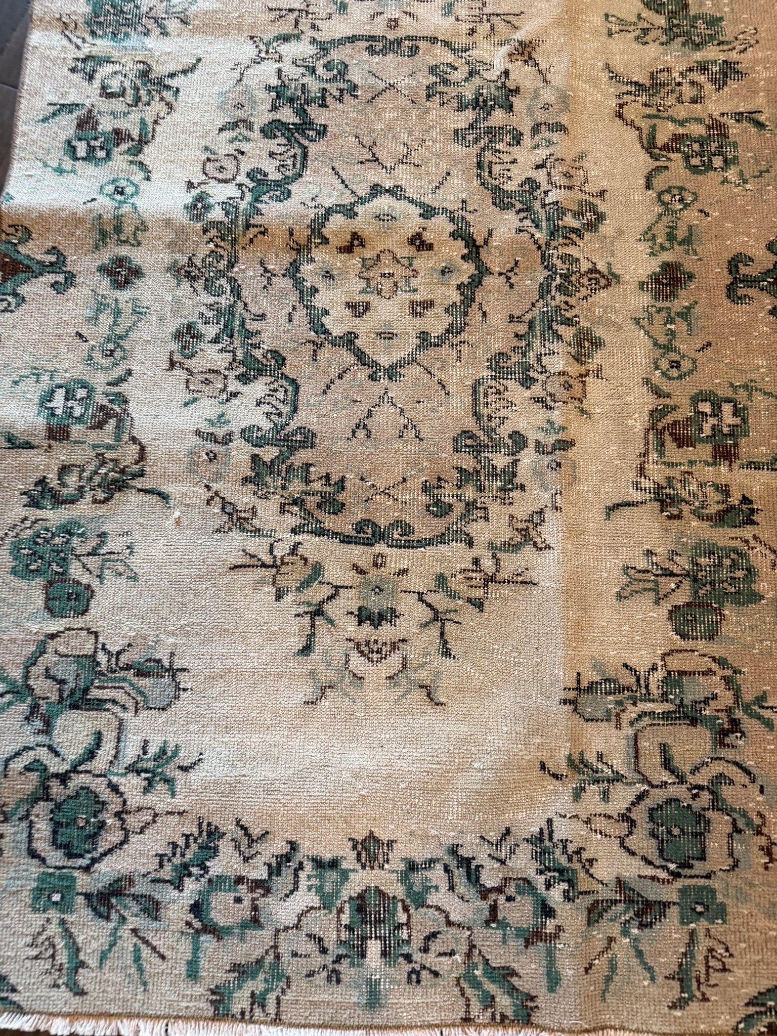 100% wool, vegetable dyed. This is a vintage item that may have some stains, wear, worn spots, repairs, holes, fading or other naturally occurring damage. We only offer items we would be happy to have in our own homes but want you to be aware that you are not purchasing brand new condition items!