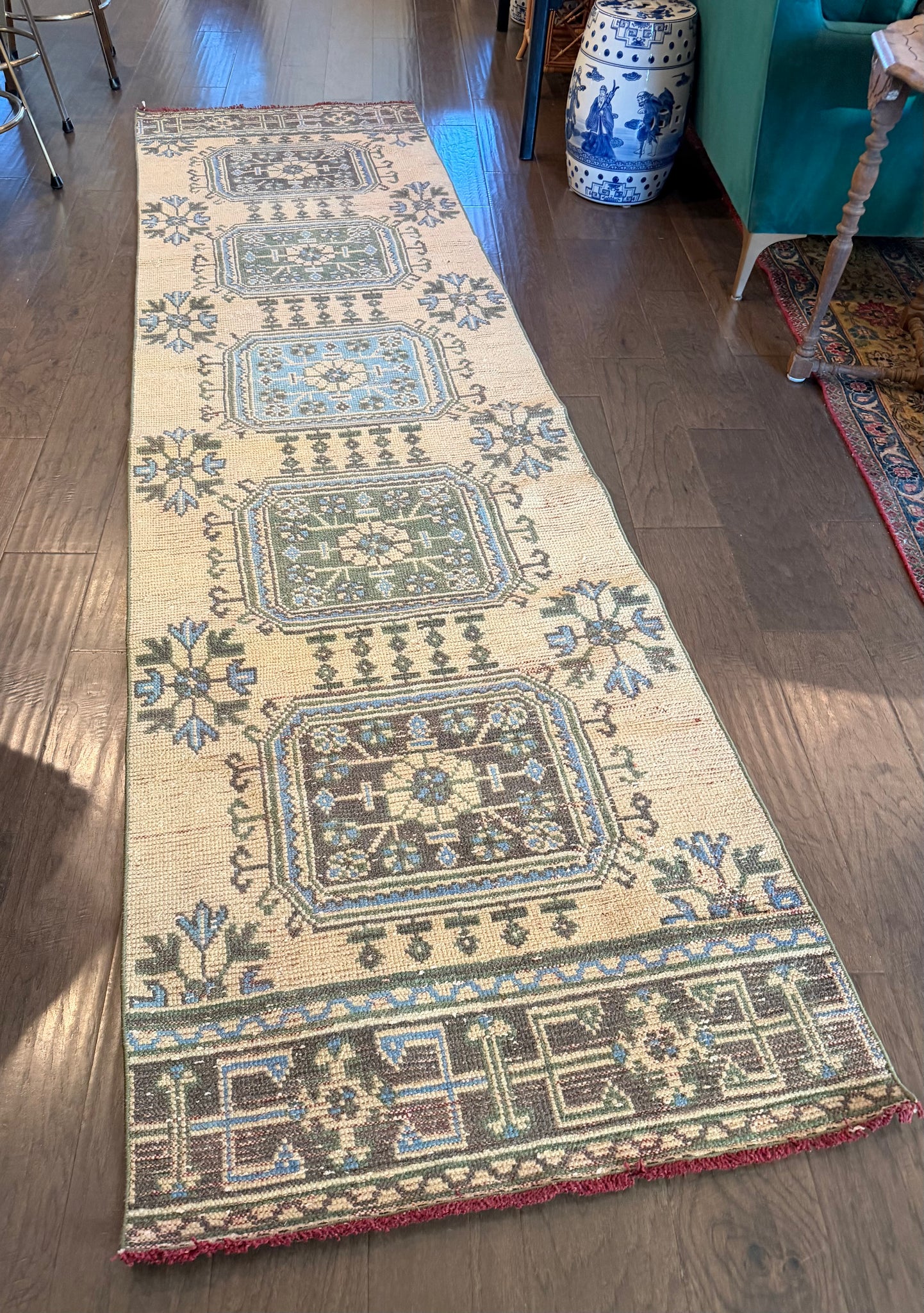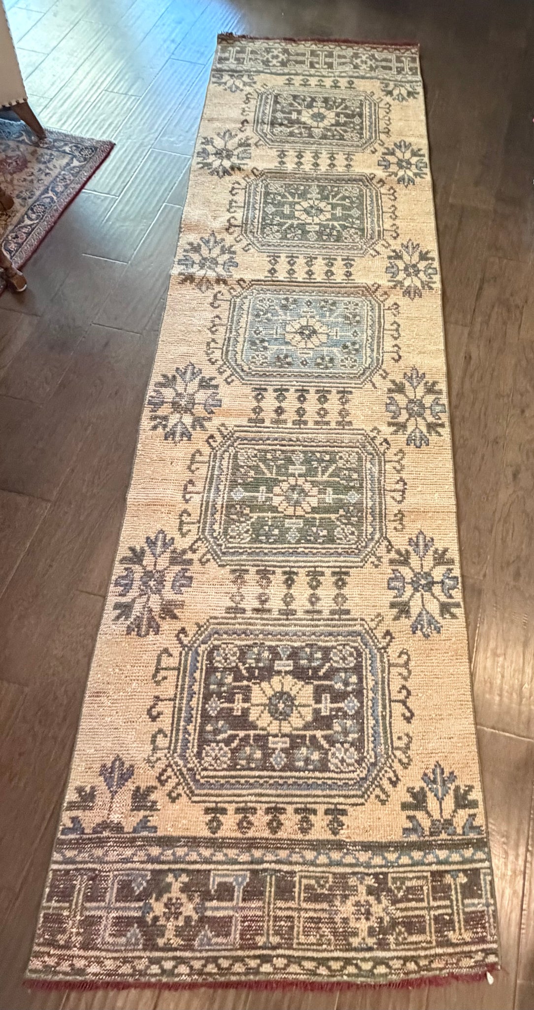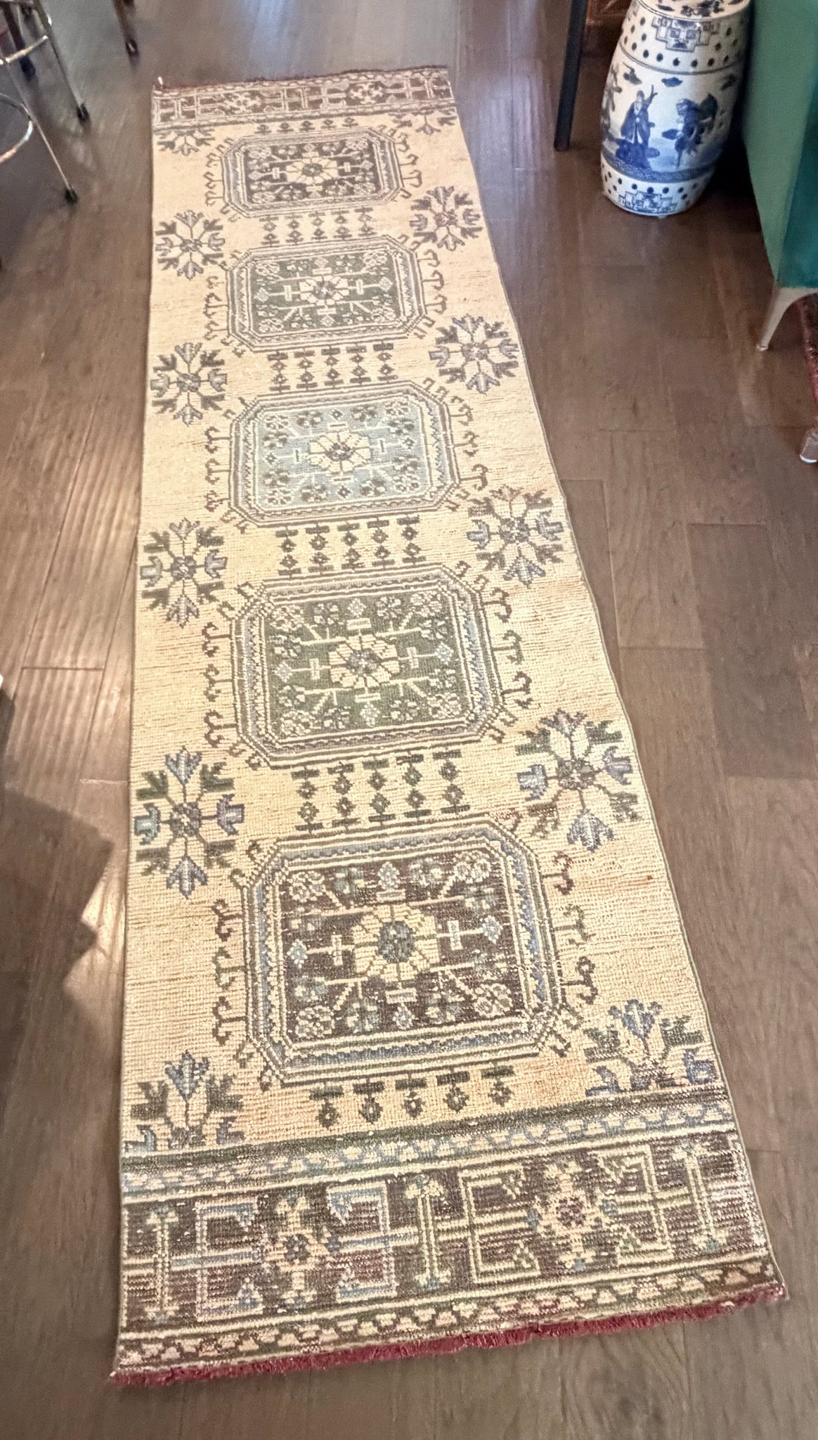 Faded yellow and blue medallion tile design runner.