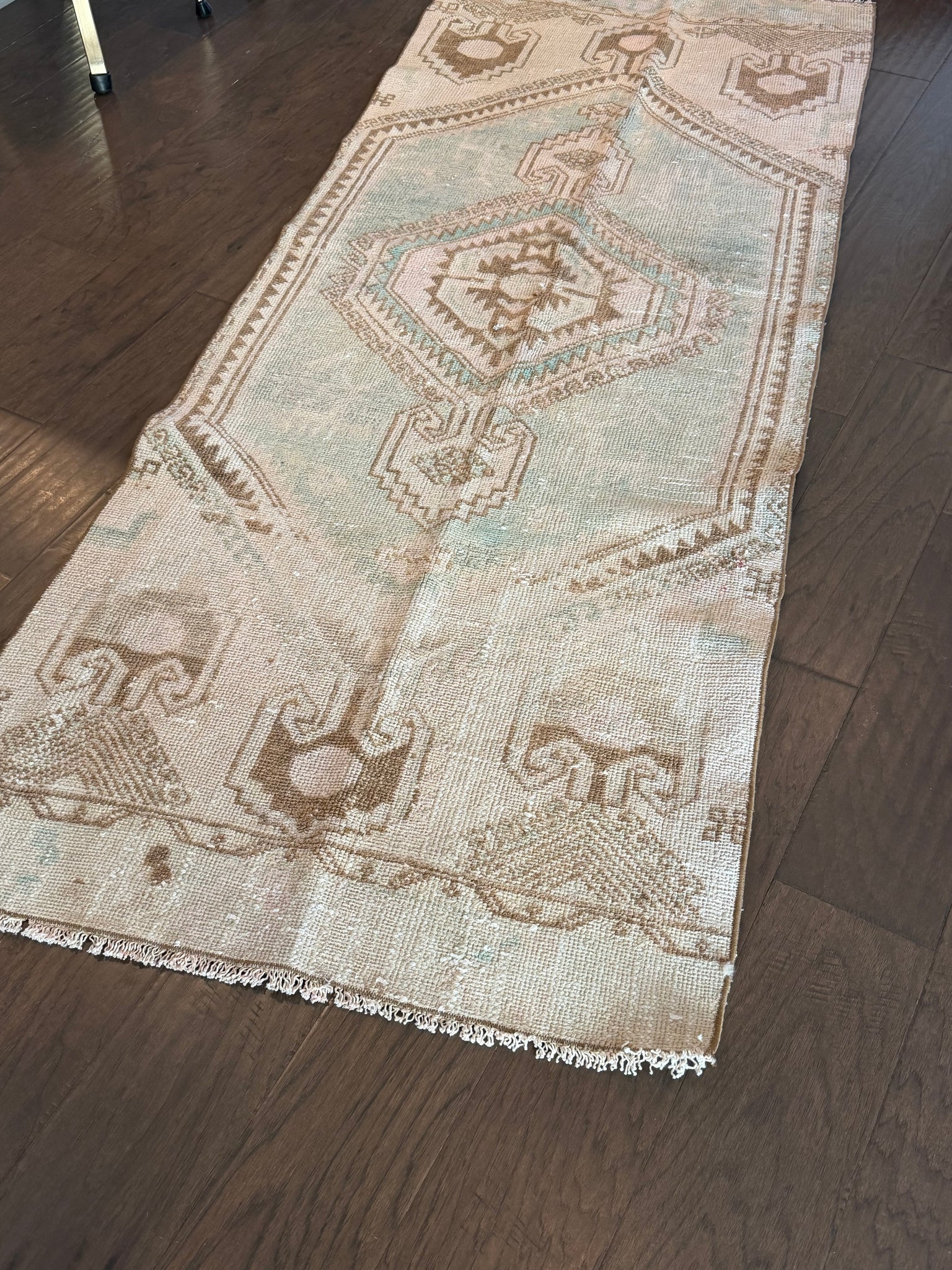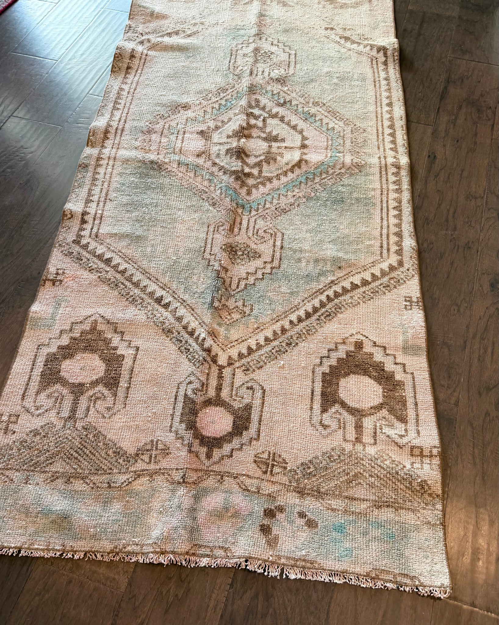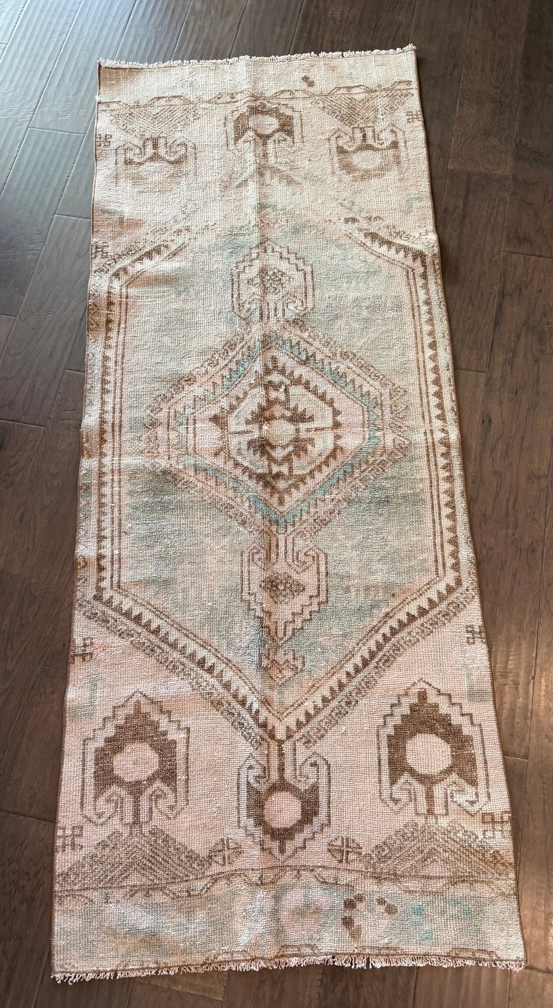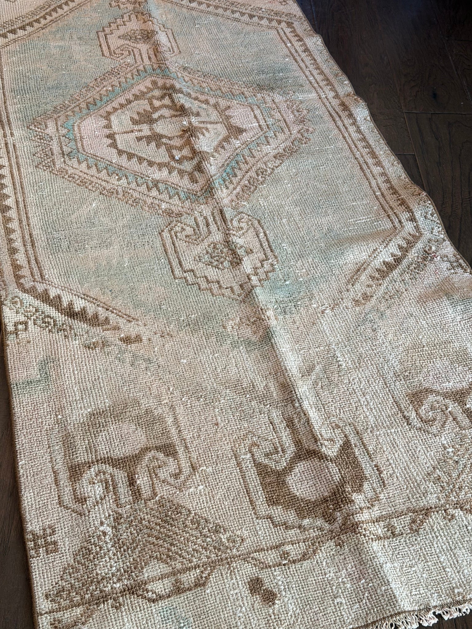 100% wool, vegetable dyed. This is a vintage item that may have some stains, wear, worn spots, repairs, holes, fading or other naturally occurring damage. We only offer items we would be happy to have in our own homes but want you to be aware that you are not purchasing brand new condition items!