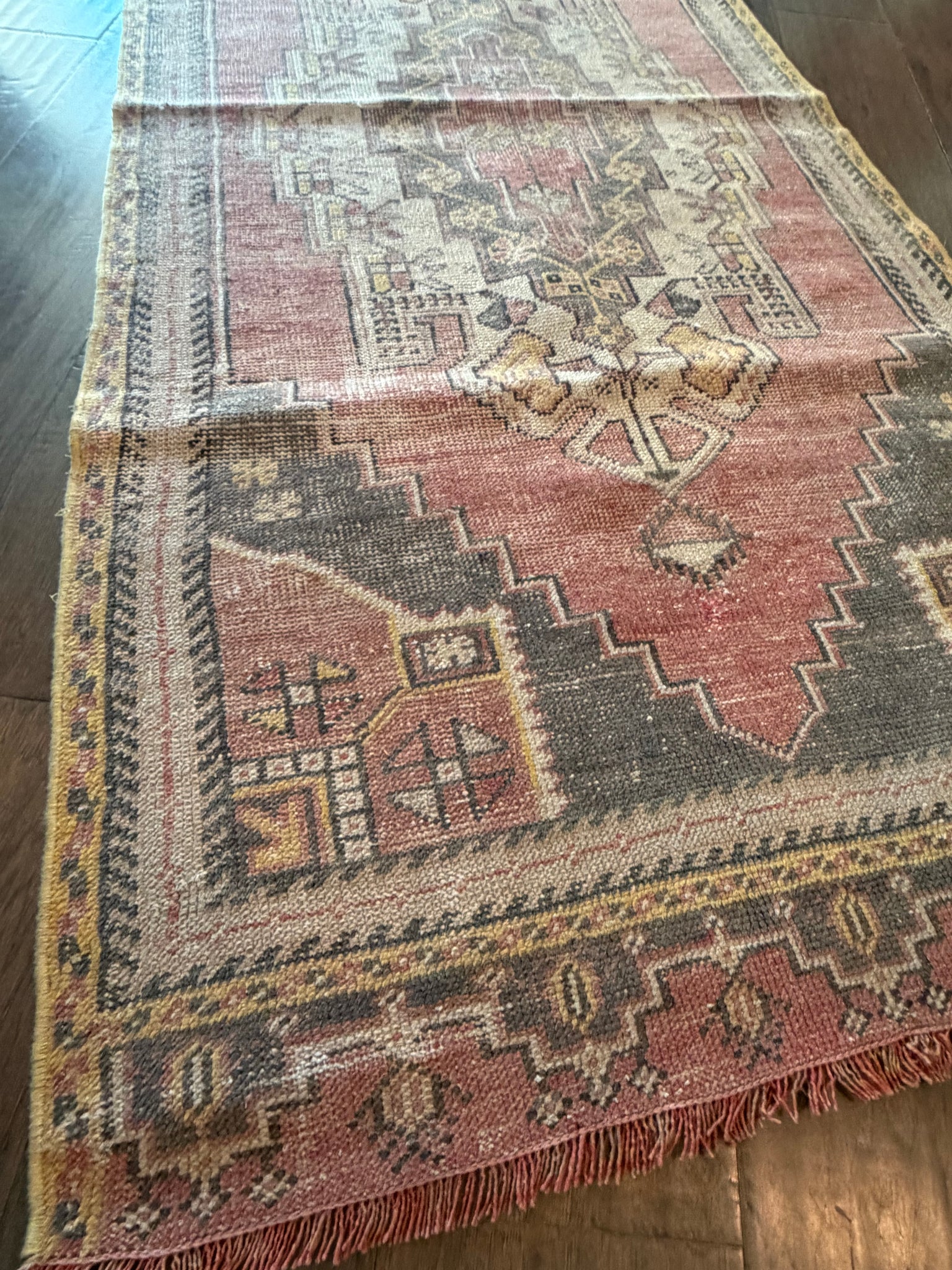 100% wool, vegetable dyed. This is a vintage item that may have some stains, wear, worn spots, repairs, holes, fading or other naturally occurring damage. We only offer items we would be happy to have in our own homes but want you to be aware that you are not purchasing brand new condition items!