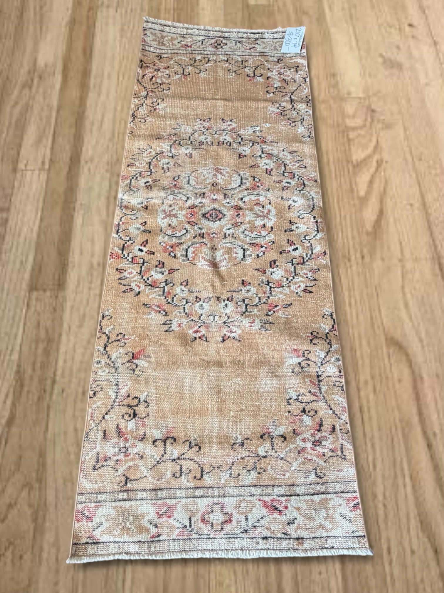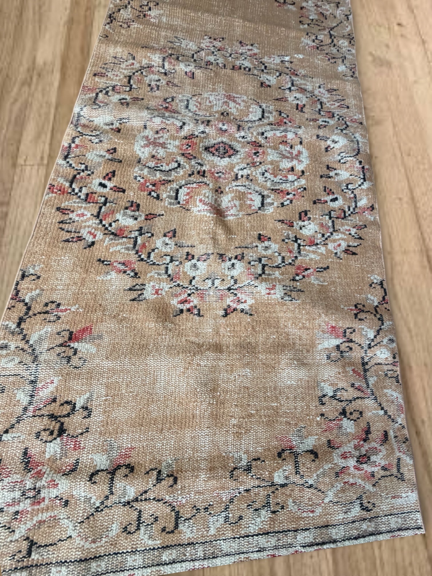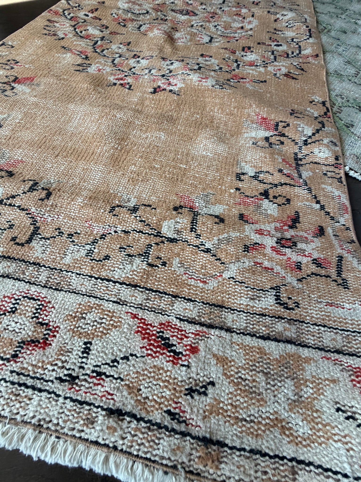 100% wool, vegetable dyed. This is a vintage item that may have some stains, wear, worn spots, repairs, holes, fading or other naturally occurring damage. We only offer items we would be happy to have in our own homes but want you to be aware that you are not purchasing brand new condition items!