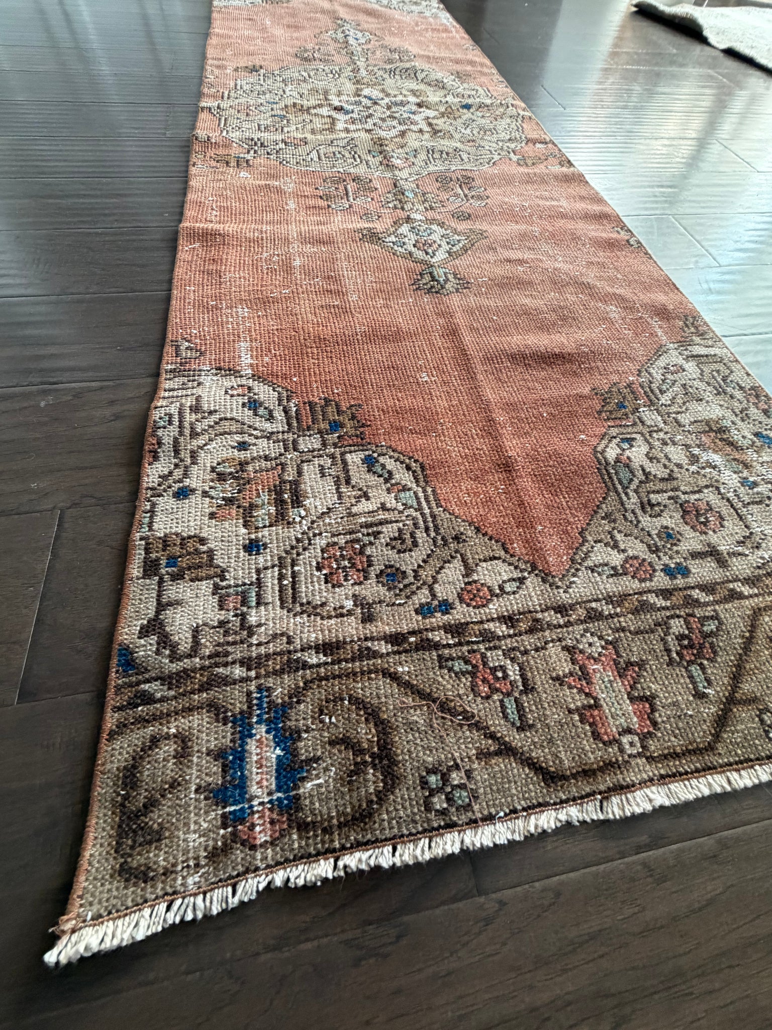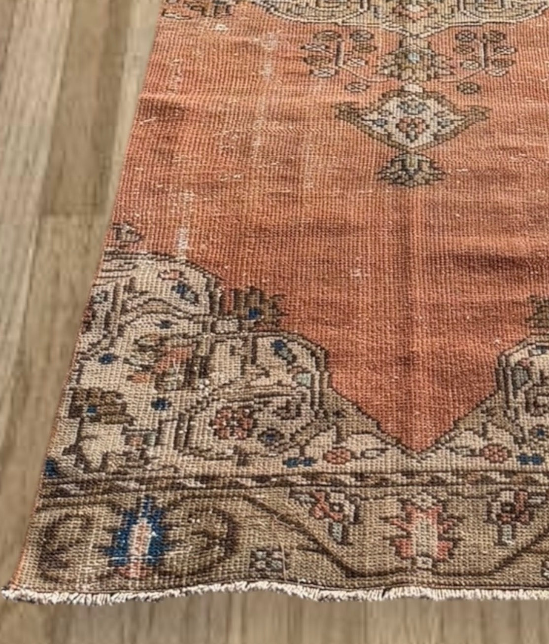100% wool, vegetable dyed. This is a vintage item that may have some stains, wear, worn spots, repairs, holes, fading or other naturally occurring damage. We only offer items we would be happy to have in our own homes but want you to be aware that you are not purchasing brand new condition items!